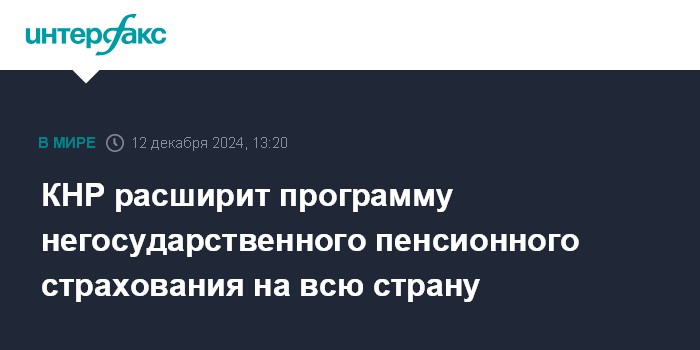 Москва. 12 декабря. INTERFAX.RU - Китайские власти в четверг объявили о расширении с 15 декабря программы негосударственного пенсионного страхования на всю страну, передает агентство "Синьхуа".