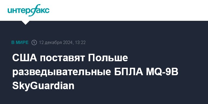 Москва. 12 декабря. INTERFAX.RU - Министерство национальной обороны Польши заключило контракт с американской корпорацией General Atomics Aeronautical Systems на поставку разведывательных беспилотников MQ-9B SkyGuardian, сообщила пресс-служба ведомства.