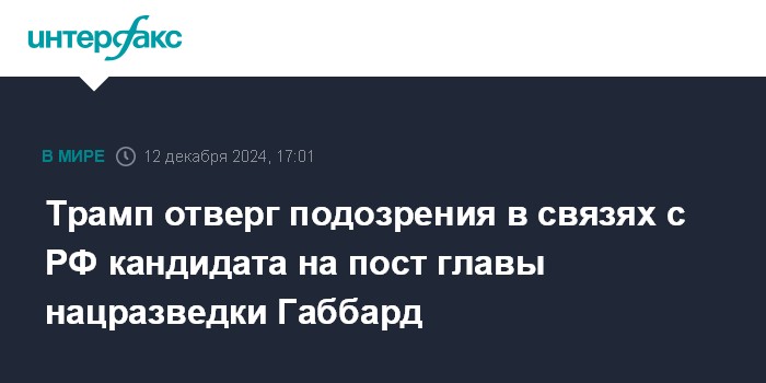 Москва. 12 декабря. INTERFAX.RU - Избранный президент США Дональд Трамп в интервью Time выразил поддержку американскому политику Тулси Габбард и заявил об уверенности в том, что она справится с обязанностями главы Национальной разведки США.