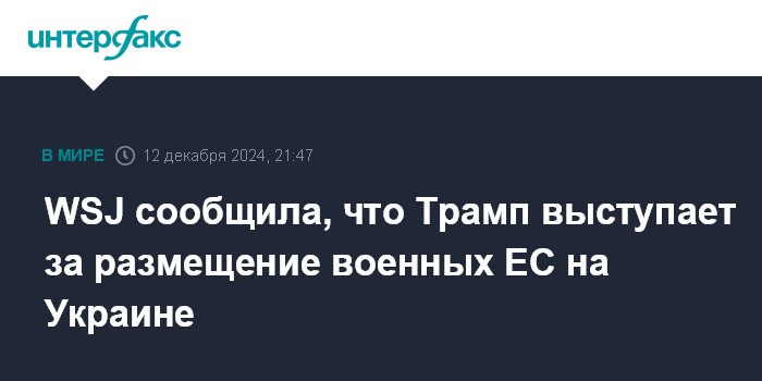 Москва. 12 декабря. INTERFAX.RU - Избранный президент США Дональд Трамп считает, что европейские силы нужно будет разместить на территории Украины для мониторинга соблюдения режима прекращения огня, пишет в четверг газета The Wall Street Journal со ссылкой на источники.