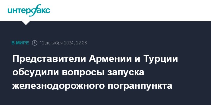 Москва. 12 декабря. INTERFAX.RU - Представители Армении и Турции провели встречу на границе двух стран по обсуждению вопросов запуска железнодорожного погранпункта, заявил вице-спикер парламента Армении, спецпредставитель по вопросам нормализации отношений между Ереваном и Анкарой Рубен Рубинян.
