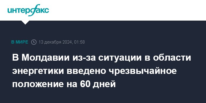 Москва. 13 декабря. INTERFAX.RU - В связи со сложной ситуацией в области энергетики в Молдавии введено чрезвычайное положение сроком на 60 дней, начиная с 16 декабря.