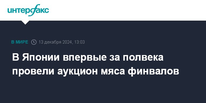 Москва. 13 декабря. INTERFAX.RU - В Японии 12 декабря на аукционах в Саппоро и в порту Симоносеки было продано примерно 1,4 тонны мяса финвалов, пишет MarketWatch.