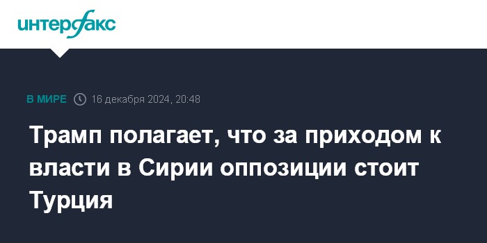 Москва. 16 декабря. INTERFAX.RU - Избранный президент США Дональд Трамп в понедельник высказал мнение, что к захвату власти в Дамаске вооруженной сирийской оппозицией привели действия Анкары.