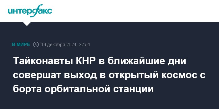 Москва. 16 декабря. INTERFAX.RU - Китайские тайконавты в ближайшие дни совершат выход в открытый космос с борта национальной орбитальной станции, сообщило в понедельник Космическое управление КНР (CMSA).