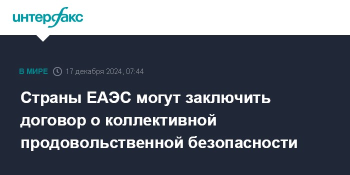 Москва. 17 декабря. INTERFAX.RU - Страны ЕАЭС планируют использовать долгосрочные механизмы в сфере сотрудничества в АПК, могут заключить договор о коллективной продовольственной безопасности, сообщил премьер-министр РФ Михаил Мишустин.