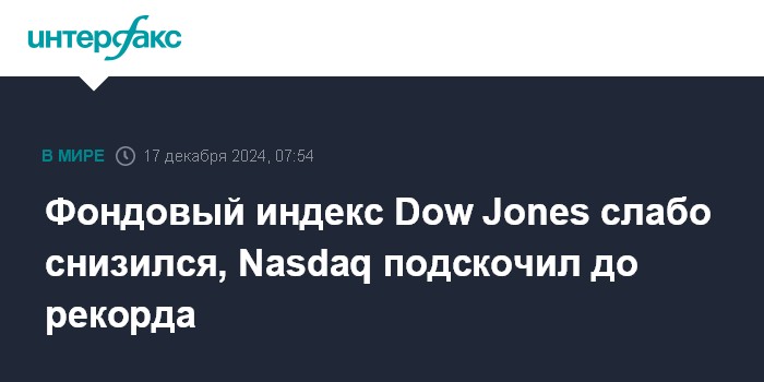 Москва. 17 декабря. INTERFAX.RU - Американский фондовый индекс Dow Jones слабо снизился в понедельник, тогда как S&P 500 умеренно вырос, а Nasdaq Composite подскочил более чем на 1% и обновил исторический максимум.