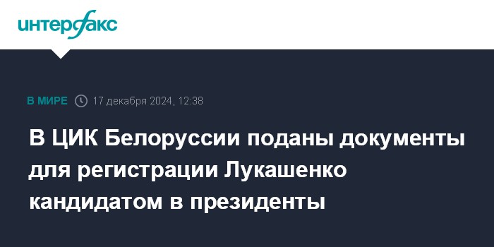 Москва. 17 декабря. INTERFAX.RU - В Центризбирком Белоруссии поданы документы для регистрации действующего главы республики Александра Лукашенко кандидатом в президенты, сообщили в пресс-службе ЦИК во вторник.