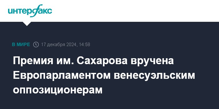 Москва. 17 декабря. INTERFAX.RU - Премия Европарламента (ЕП) имени Андрея Сахарова "За свободу мысли" за 2024 год вручена во вторник в Страсбурге венесуэльскому оппозиционному политику Марии Корине Мачадо и бывшему кандидату в президенты Венесуэлы Эдмундо Гонсалесу Уррутиа.