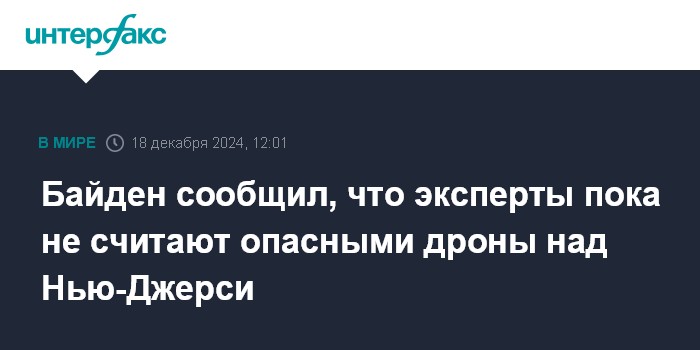 Москва. 18 декабря. INTERFAX.RU - Власти США изучают проблему неопознанных беспилотников, замеченных в небе над Нью-Джерси и некоторыми другими штатами, но пока не считают их угрозой, заявил журналистам президент Джо Байден. Об этом пишет The Hill.
