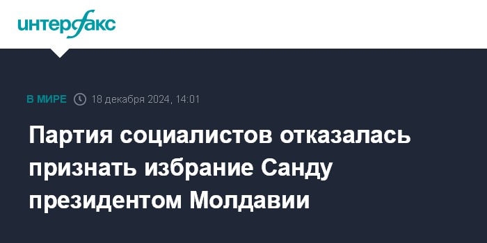 Москва. 18 декабря. INTERFAX.RU - Республиканский совет Партии социалистов (ПСРМ) заявил, что партия не будет признавать Майю Санду законно избранным президентом Молдавии.