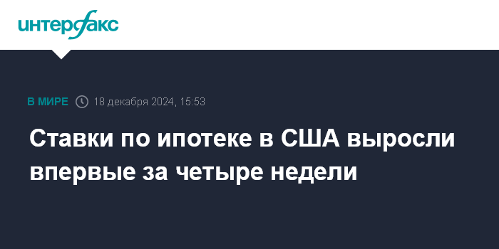 Москва. 18 декабря. INTERFAX.RU - Средний размер ставок по долгосрочным ипотечным кредитам в США увеличился на 8 базисных пунктов на прошлой неделе, до этого показатель рос три недели подряд.