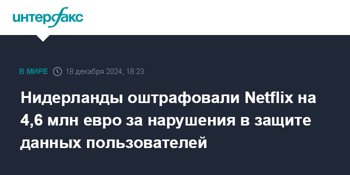 Москва. 18 декабря. INTERFAX.RU - Управление по защите данных Нидерландов (DPA) оштрафовало Netflix Inc. на 4,57 млн евро, посчитав, что компания не предоставляла пользователям достаточной информации относительно обработки их данных.