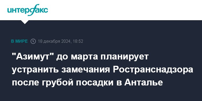 Москва. 18 декабря. INTERFAX.RU - Авиакомпания "Азимут" по итогам проверки Ространснадзора в связи с грубой посадкой SJ-100 в Анталье (Турция) получила пять предписаний, замечания по ним рассчитывает устранить до марта следующего года, сообщила пресс-служба компании.