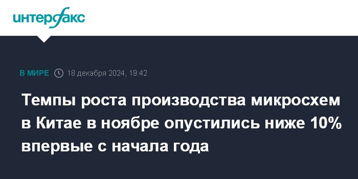 Темпы роста производства микросхем в Китае в ноябре опустились ниже 10% впервые с начала года