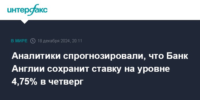 Аналитики спрогнозировали, что Банк Англии сохранит ставку на уровне 4,75% в четверг