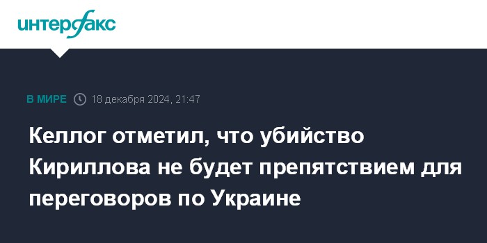Москва. 18 декабря. INTERFAX.RU - Будущий спецпосланник США по Украине и России Кит Келлог заявил, что, по его мнению, убийство начальника войск радиационной, химической и биологической защиты Вооруженных сил РФ генерал-лейтенанта Игоря Кириллова не окажет влияния на возможные переговоры по урегулированию кризиса на Украине.