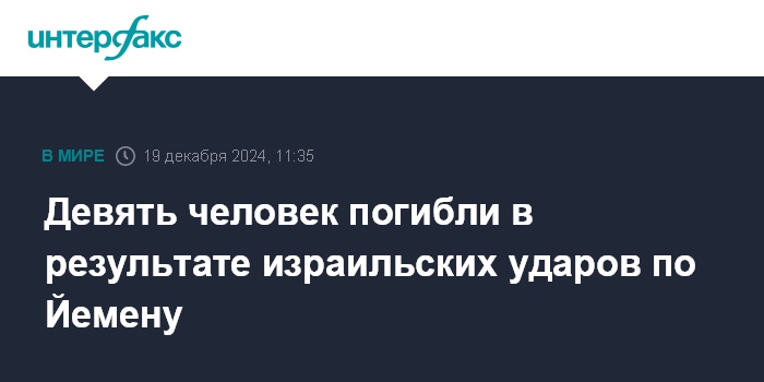 Москва. 19 декабря. INTERFAX.RU - Удары Армии обороны Израиля в четверг по предполагаемым позициям хуситов в Йемене привели к гибели девяти человек, сообщают арабские СМИ.
