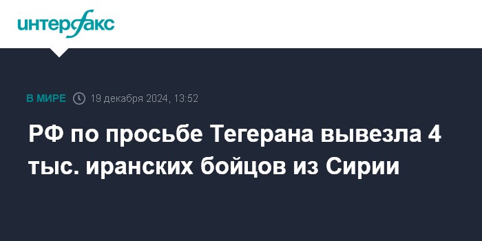 Москва. 19 декабря. INTERFAX.RU - Россия вывезла 4 тыс. иранских бойцов из Сирии в Тегеран по просьбе иранских властей, сообщил президент РФ Владимир Путин.