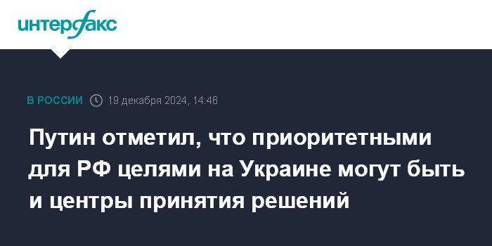 Москва. 19 декабря. INTERFAX.RU - Президент РФ Владимир Путин заявил, что приоритетными целями для Вооруженных сил РФ на Украине являются военные объекты, но не исключены и центры принятия решений.