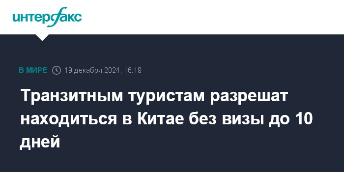 Москва. 19 декабря. INTERFAX.RU - Власти Китая увеличили срок безвизового транзита и количество пунктов, через которые возможен такой транзит, для граждан 54 стран, в том числе России, сообщают местные СМИ.