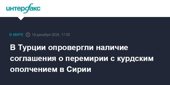Москва. 19 декабря. INTERFAX.RU - Никакого соглашения о перемирии с Рабочей партией Курдистана (РПК) или Силами самообороны сирийских курдов (YPG) в Сирии нет, заявил в четверг представитель Минобороны Турции Зеки Актюрк.
